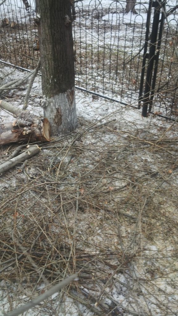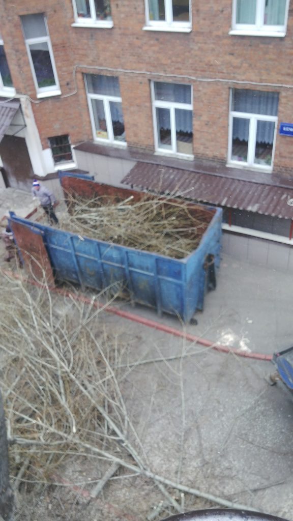 Произвели обрезку плодовых деревьев (яблони, вишни, груши и т.д.). Точное количество деревьев сложно назвать, так как считали контейнерами, у нас их было два. Вся работа была сделана за 3 дня. Процесс работы осложнялся, удаленностью от контейнера порубочных остатков, в связи с этим, увеличилось время погрузки. Под этот объект купили высоторез, все спилы были закрашены.